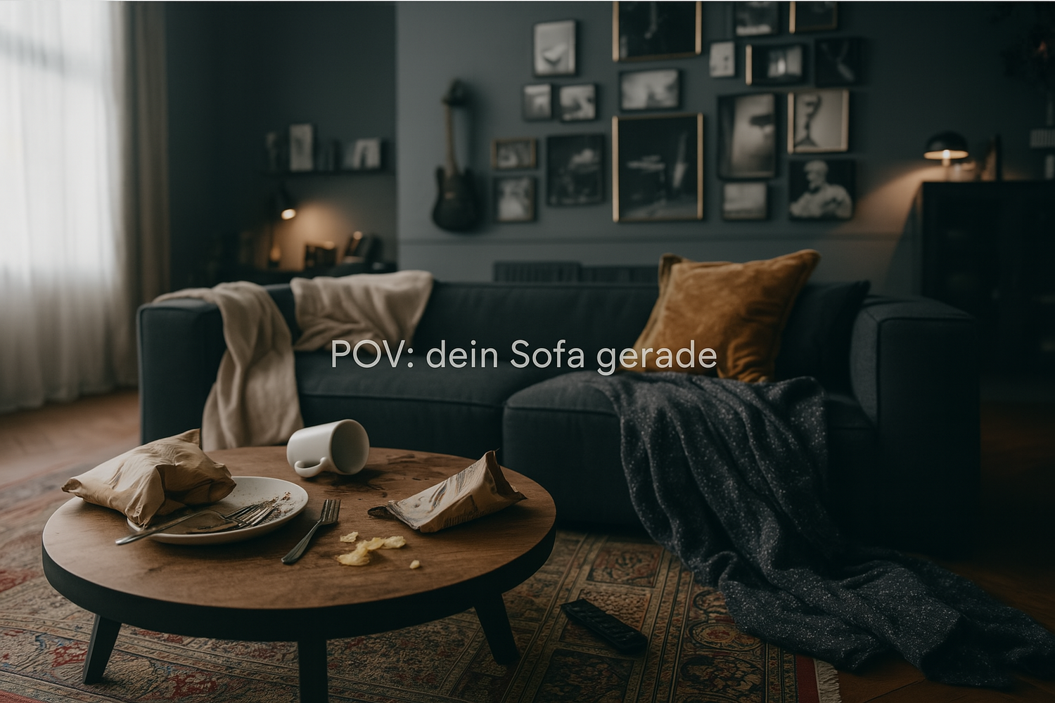 Zwischen Pizzakarton, zerknüllten Taschentüchern und balancierenden Tassen wird deine Couch zur Chaos-Zone 🤯💩